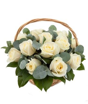 Стильная корзина из 11 нежно-белых роз будет превосходным подарком для любого человека, особенно цветам обрадуется женщина. Букет уместен на свадьбе или на другом важном торжестве. Также его дарят возлюбленным, так как белые розы отлично передают нежность и чистоту человека, отношений и намерений. Стильное украшение цветочной композиции, где к розам добавлены эвкалипт и салал, убедят получателя в вашем непревзойденном вкусе. Легкий запах придется по вкусу дорогому человеку.